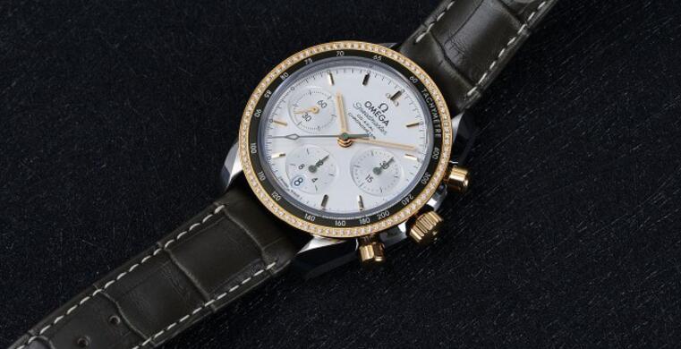 With steel and yellow gold case matching the light silver dial, this diamonds bezel replica Omega Speedmaster presents us the wonderful visual effect. It adopted the unique double bezels, decorating with dazzling diamonds, which just echoing with the green little pointers.